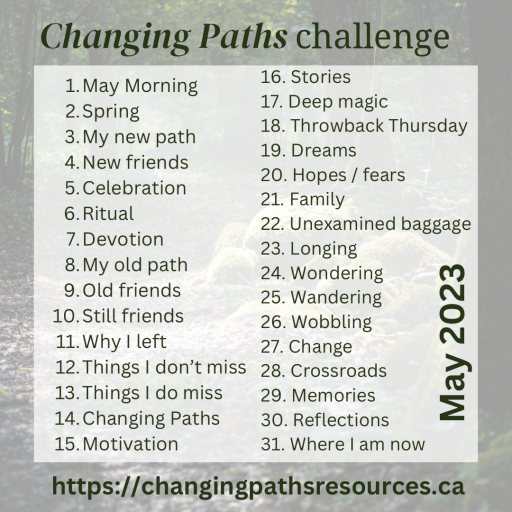 The Changing Paths challenge for May 2023. Feel free to skip a day or post something different from the topic of the day, but if you do the whole thing, I think you’ll arrive at a new perspective on your path.
